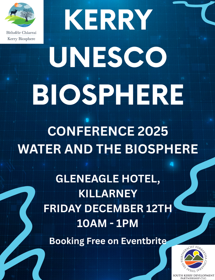We are delighted to host our end of year Conference in the Gleneagle Hotel, Killarney on Friday December 12th at 10am until 13:00pm. We will be focussing on water and the biosphere including nature-based solutions for water management, and the health of our natural waterbodies. This is a free event with thanks to support from Kerry County Council.